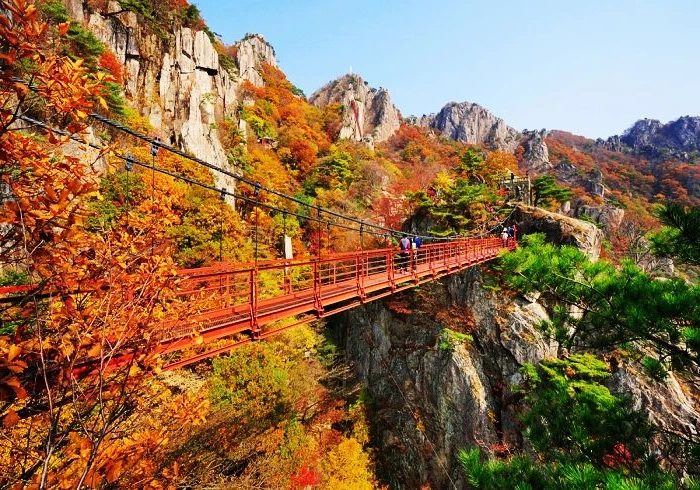 Wolchulsan National Park may be South Korea’s smallest, but its Cloud Bridge is among the most dramatic. Clinging to cliffs, the bridge offers heart-stopping views and a steep, challenging crossing. Despite its daunting look, it attracts those eager to conquer its heights and take in the stunning scenery.