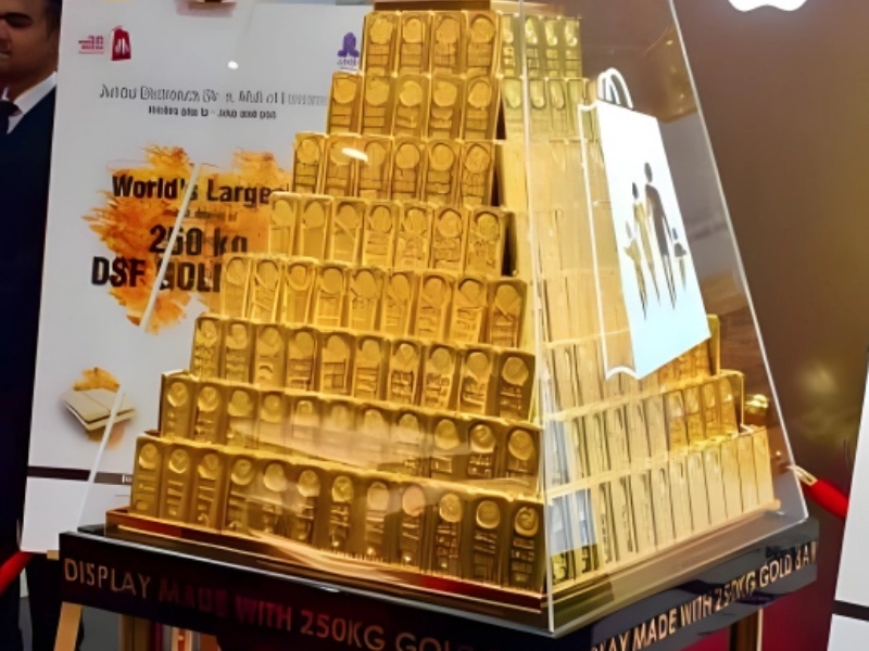 Die Mall of the Emirates in Dubai beherbergt diesen atemberaubenden Anblick: 250 kg Goldbarren zur Schau gestellt! Das entspricht 551 Pfund Gold. Das Gold, dessen Wert auf 9,53 Millionen US-Dollar geschätzt wird, ist so angeordnet, dass es einer Einkaufstasche ähnelt. Diese auffällige Installation ist im Jumbo-Store der Mall zu sehen.