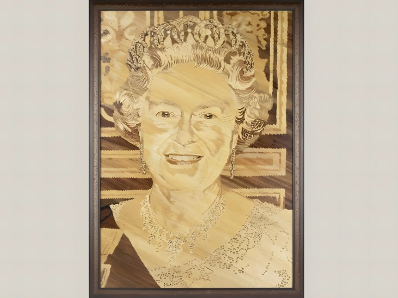 Empfängerin: Elizabeth II., die Königin Geber: Paul Kagame aus Ruanda; geschätzter Wert: nicht angegeben Bei diesem Porträt handelt es sich um ein faszinierendes Kunstwerk aus dem 20. Jahrhundert, das eine besondere Technik zeigt. Anstelle von Farbe und Leinwand wurden gefärbte Bananenblätter in verschiedenen Nuancen verwendet, um das Abbild einer Person zu weben – in diesem Fall von Königin Elizabeth II. Das gerahmte Bild wurde ihr im Dezember 2006 vom ruandischen Präsidenten Paul Kagame überreicht.