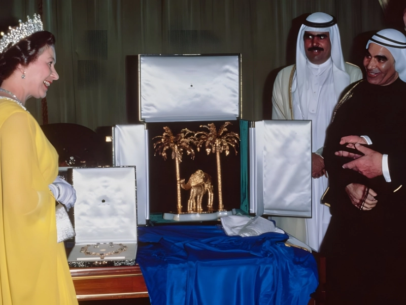 Empfängerin: Elizabeth II., die Königin Geber: Vereinigte Arabische Emirate; geschätzter Wert: nicht verfügbar Königin Elizabeth II. war die großzügige Geschenkkultur der Vereinigten Arabischen Emirate wohlbekannt. Über die Jahre erhielt sie zahlreiche bemerkenswerte Gaben, doch laut ABC News war die „Skulptur eines Kamels mit seinem Kalb unter zwei Palmen, gefertigt aus massivem Gold“, vielleicht das beeindruckendste Stück.