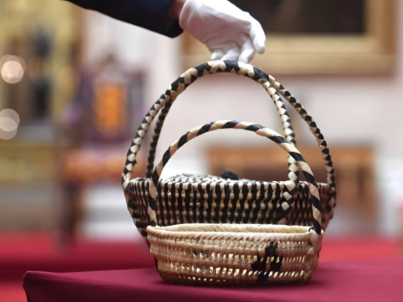 Empfängerin: Elizabeth II., die Königin Geberin: Salote Tupou von Tonga; geschätzter Wert: 100 US-Dollar* Während ihrer Commonwealth-Reise im Jahr 1953 wurde die Königin mit einer Fülle von Geschenken bedacht. Darunter befand sich auch ein Korb aus Kokosnuss-Blättern, überreicht von der am längsten regierenden tongaischen Königin, Queen Salote Tupou, die fast 48 Jahre lang herrschte. Während ihres Aufenthalts nahmen die Königin und der Duke of Edinburgh auch tongaische Bräuche an, wie etwa das Essen mit den Fingern im Sitzen auf dem Boden.