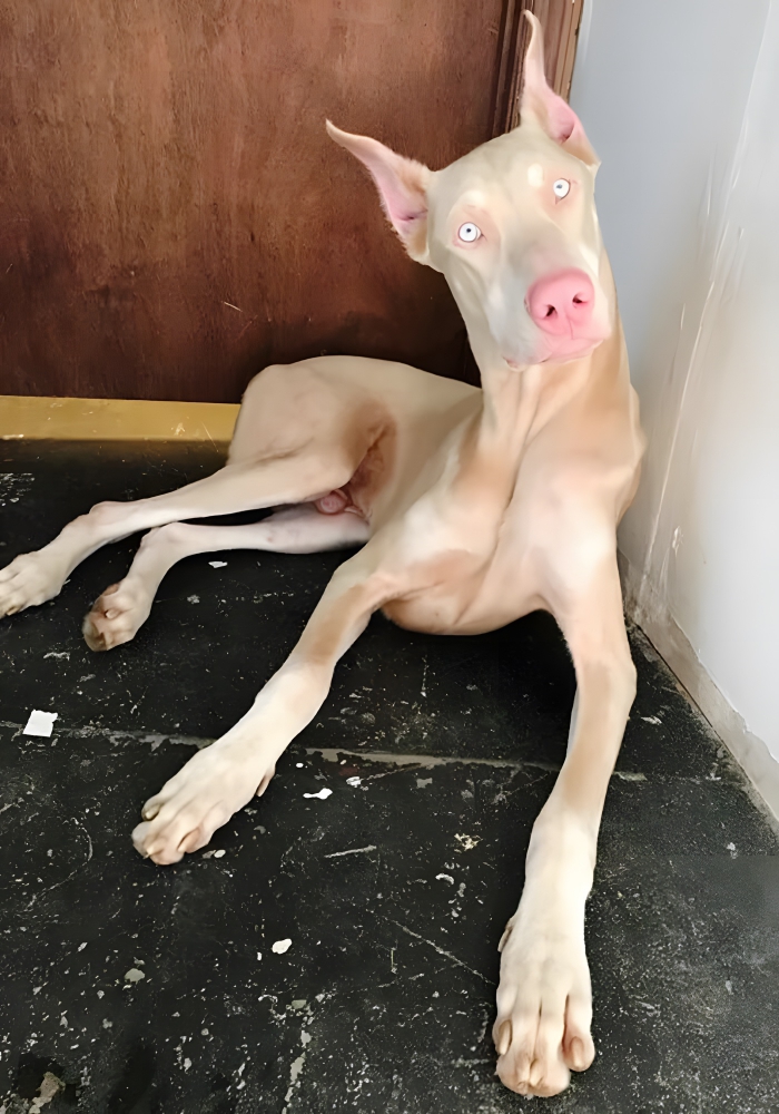 Das hier ist Spade, der unglaubliche Albino-Dobermann. Innerhalb seiner Rasse ist dieser nicht gerade kleine Welpe einzigartig mit seinem gold-cremefarbenen Haar und den extrem hellblauen Augen. Haben Sie jemals einen Dobermann gesehen, dem das typische Schokoladenbraun fehlt? Spades ungewöhnliche Farbe lässt ihn großartig aussehen und würde ihm helfen, sehr leicht einen Job als erfolgreiches Haustiermodel zu bekommen. Nicht nur sein Aussehen ist bemerkenswert, sondern auch selten, da pigmentlose Albino-Hunde sehr rar sind. Spade ist einzigartig, auch wenn er eine gewisse Färbung aufweist, was eher häufiger vorkommt. Passen Sie auf, Welt – ein neuer Dobermann ist im Anmarsch! Mit seinem anziehenden Aussehen könnte er Ihnen nicht nur alle Hundedamen, sondern auch die meisten menschlichen Freundinnen stehlen! Er ist eine Freude, in seiner Nähe zu sein, dank seines tollen Aussehens und seiner unbeschwerten Art. Ob er im Garten rennt oder auf der Couch entspannt, Spade verkörpert die Schönheit der Vielfalt in der Hundewelt und erinnert uns daran, dass jeder Hund eine individuelle Persönlichkeit und einen eigenen Charme hat.