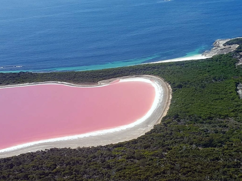 Situé près de la côte sud de l'Australie-Occidentale, le lac Hillier est l'un des lacs roses les plus célèbres au monde. Le meilleur point de vue est incontestablement celui offert par un survol en hélicoptère, qui permet une vue aérienne époustouflante sur ce lac rose bonbon se détachant sur le bleu profond de l'océan Austral. Depuis les airs, l'expérience révèle le contraste saisissant entre la couleur rose vif du lac et la forêt d'eucalyptus verdoyante alentour. Au départ d'Esperance, les excursions en hélicoptère durent généralement deux heures et offrent aux photographes et amoureux de la nature l'occasion idéale de capturer les teintes à couper le souffle du lac. Le milieu de matinée est le moment optimal pour l'observation, car la position du soleil accentue la teinte rose sans générer trop de reflets à la surface de l'eau. Observer la structure parfaitement circulaire du lac et sa proximité avec l'océan depuis la plateforme de l'hélicoptère offre un point de vue inégalable, impossible à reproduire depuis le sol. L'altitude permet aux visiteurs d'apprécier toute la circonférence du lac et son dégradé de couleurs spectaculaire, c'est pourquoi les photographes professionnels recommandent souvent cette perspective aérienne pour saisir la véritable échelle de cette merveille naturelle. Les organisateurs de vols ont soigneusement choisi des trajectoires qui optimisent les possibilités d'observation tout en maintenant une distance respectueuse pour préserver l'écosystème fragile du lac.