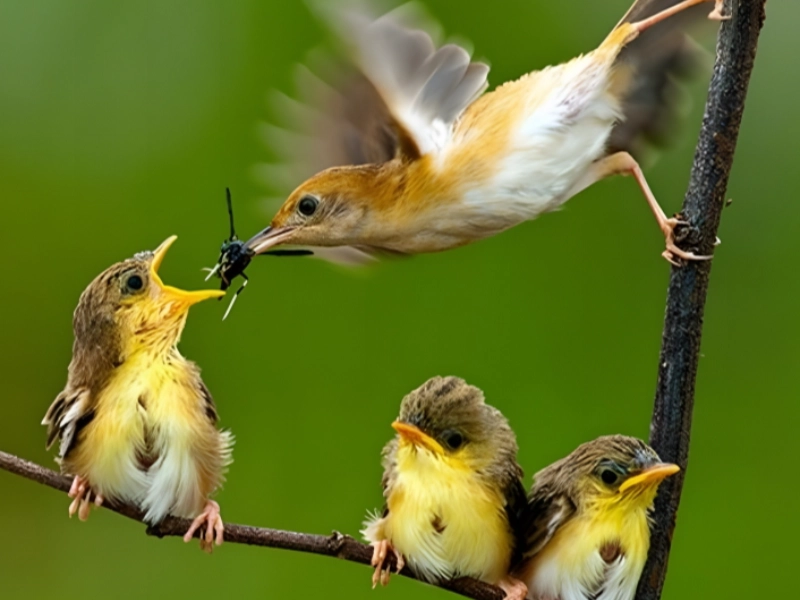 L'oiseau mère, dévouée, nourrit chacun de ses oisillons à tour de rôle avec une infinie patience.