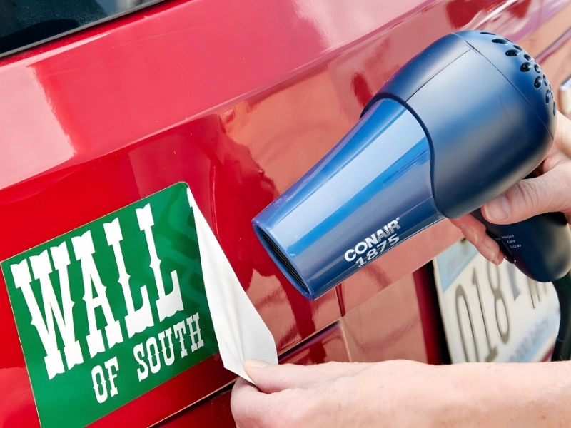 Pendant que vous chauffez l'autocollant, vérifiez périodiquement si les bords commencent à se décoller. Vous pouvez le tester délicatement avec votre ongle ou un grattoir en plastique. Évitez les outils métalliques qui pourraient rayer la peinture. Une fois que les bords se soulèvent, continuez à appliquer de la chaleur tout en décollant doucement l'autocollant à partir d'un coin. S'il résiste, appliquez plus de chaleur et réessayez. L'essentiel est de garder l'adhésif chaud et malléable pour faciliter le retrait.