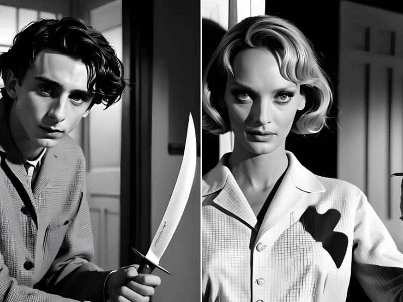 Merci à Lucas Bostwick Application utilisée : Non vérifiée Lucas Bostwick, créateur d’IA, a donné à Timothée Chalamet et Uma Thurman l’occasion d’incarner Norman Bates. Dans ce rôle, ils semblent tous deux très crédibles (avions-nous vraiment imaginé qu’Uma était allée si loin depuis ses jours de *Kill Bill* ?).
