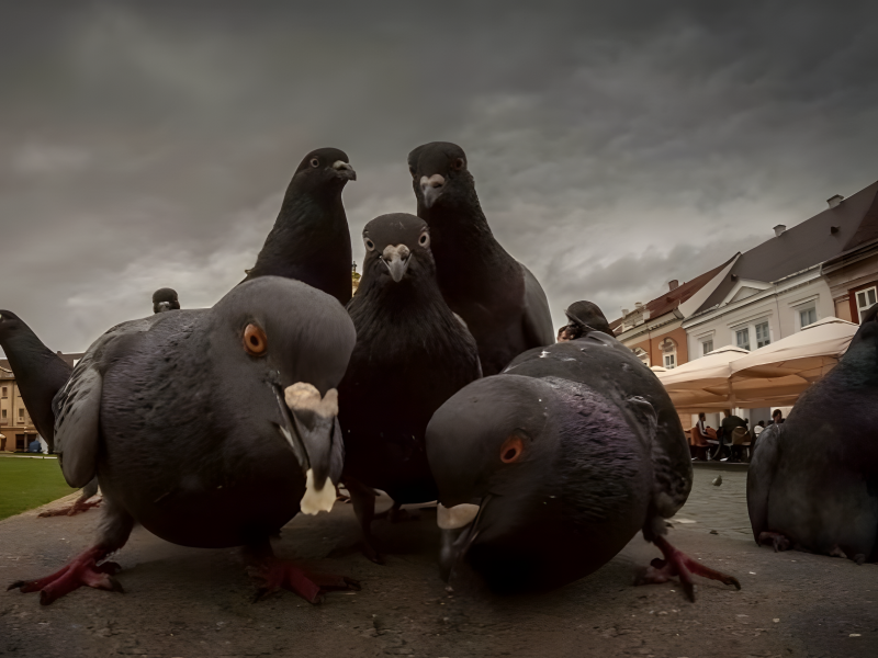 これらのハトは劇的な対決の構えを見せ、羽を逆立て、決意に満ちた眼差しで固唾を飲んで見守っていました。緊張が頂点に達したまさにその時、ひとつのパン粉が彼らの真ん中に投げ込まれ、瞬間的に彼らの注意をそらし、状況を和らげました。動物の世界では優先順位がいかに簡単に変わり得るかの滑稽な reminder です!