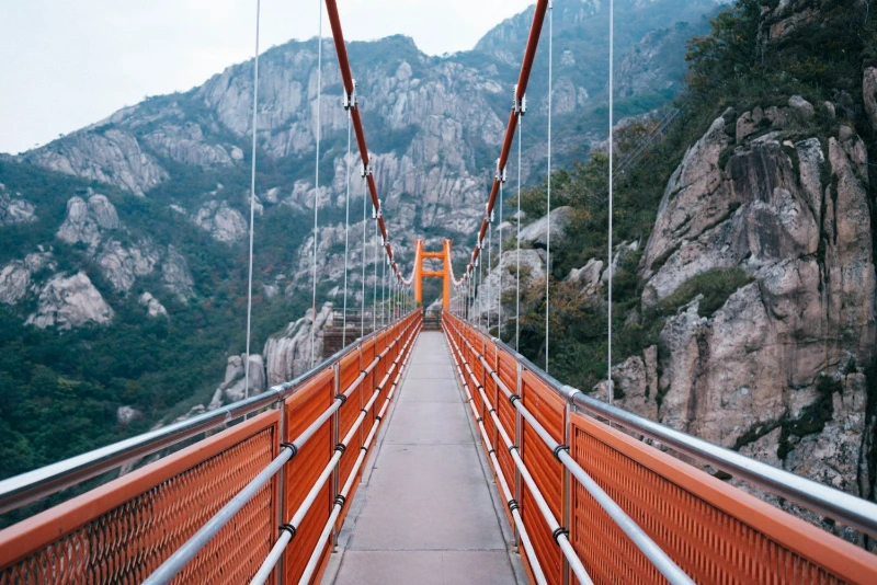 韓国の月出山国立公園にある雲の橋は、国内で最も急勾配でスリリングな橋の一つです。深い谷の上120メートルに吊るされたこの52メートルの橋は、しばしば霧に包まれ、夢のような設定を作り出します。