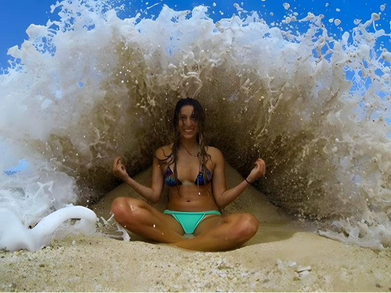 完璧なビーチ写真——太陽、砂、そして空気中のほのめかされた悪戯、何か予期せぬことの直前に。設定の美しさは被写体の遊び心のあるエネルギーによってのみ匹敵され、この写真を魅力的で楽しいものの両方にしています。それはたとえ予期せぬ方向に向かっても小さな瞬間を大切にすることを思い出させてくれるスナップショットです。