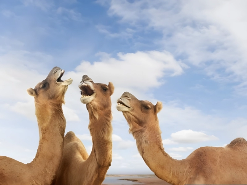 この奇想天外なシーンでは、ラクダの群れがグループパフォーマンスに従事しているように見え、彼らの口はお気に入りの曲を歌っているかのように開いています。同期した表情と遊び心のある態度は連帯感を作り出し、砂漠を舞台に変えます。この写真は過酷な環境での生活の明るい側面を捉え、そこでは最も頑健な動物でさえ楽しみと団結のための時間を見いだします。それは友情と音楽の普遍的な言語の喜びに満ちた祝賀です。